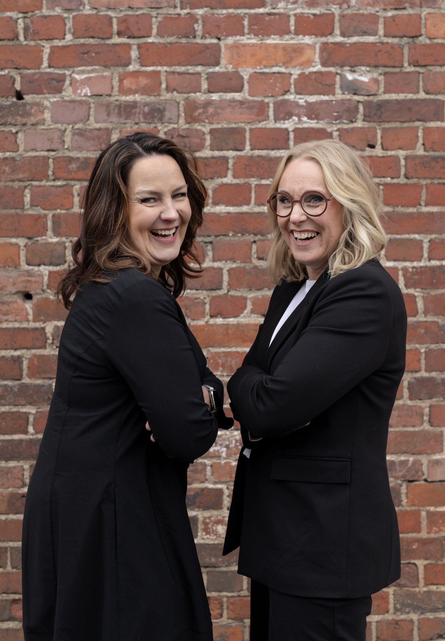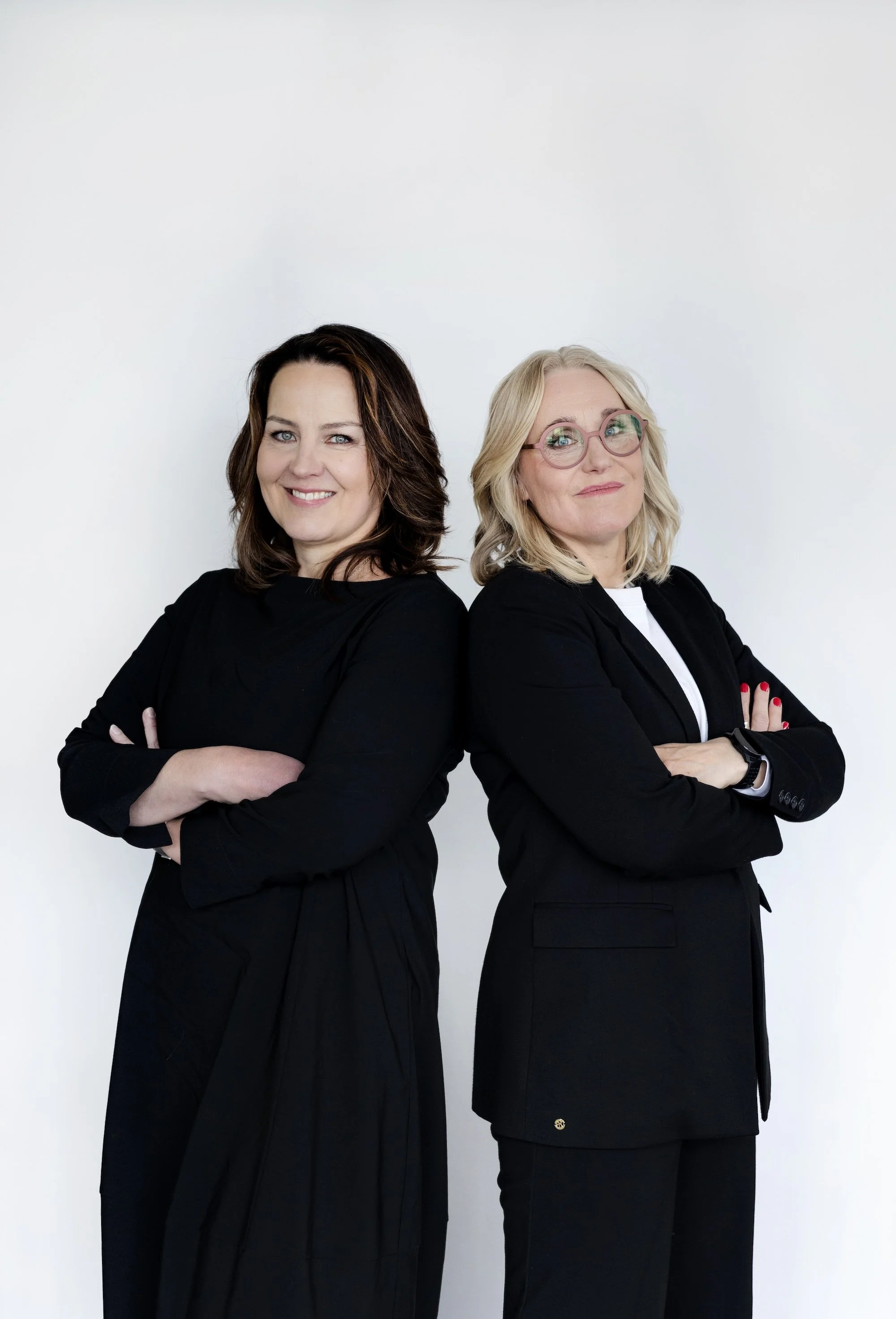 Johanna seisoo kädet ristissä mustassa bleiserissä ja hymyilee kameralle.